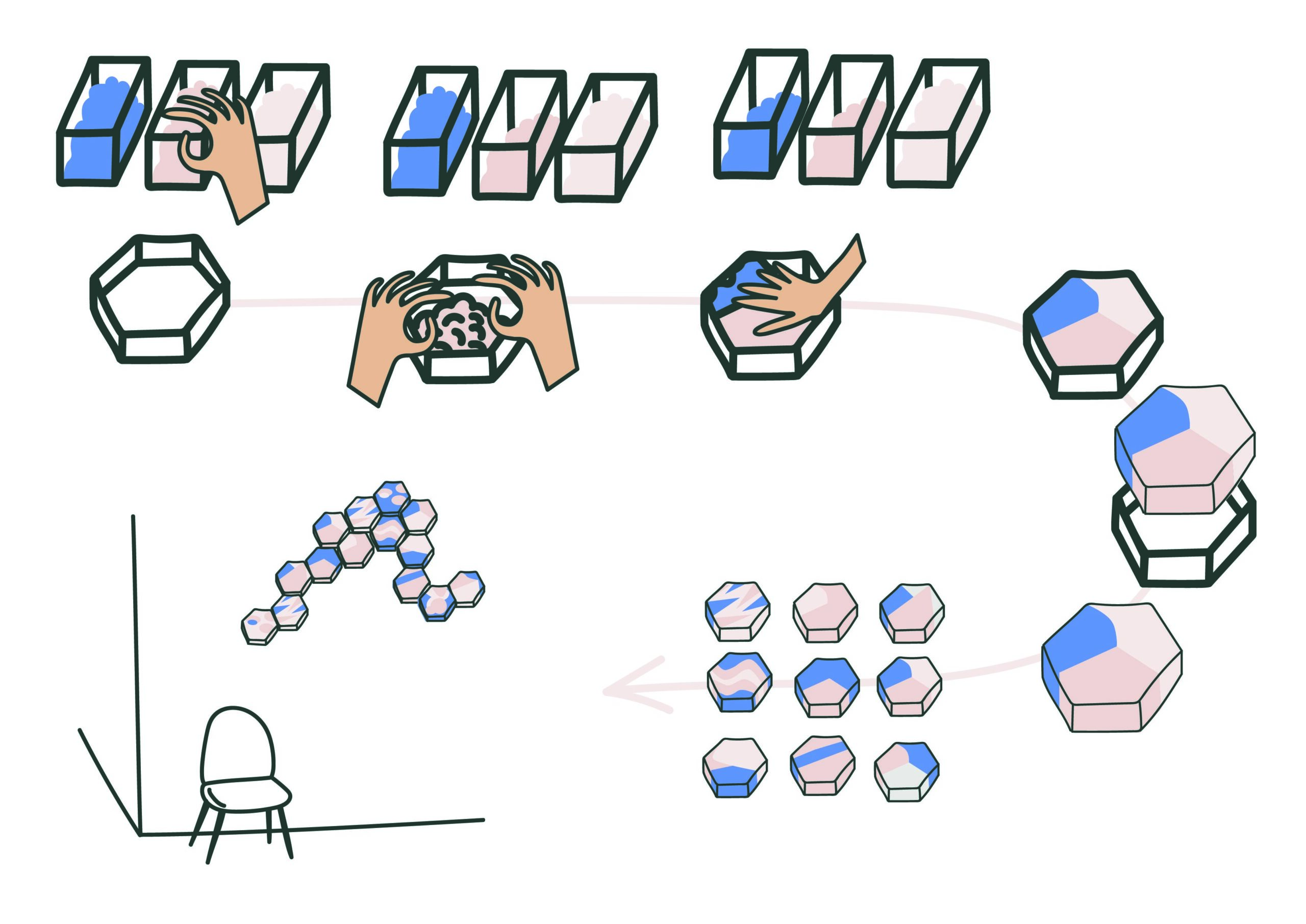 Je souhaite proposer un atelier de design participatif où chaque participant remplit une forme hexagonale en papier recyclé pour répondre à une question sur l’écologie (qui reste à définir). Les trois couleurs définies sont associées à des mots, des idées, des ressentis et permettent une réponse libre.